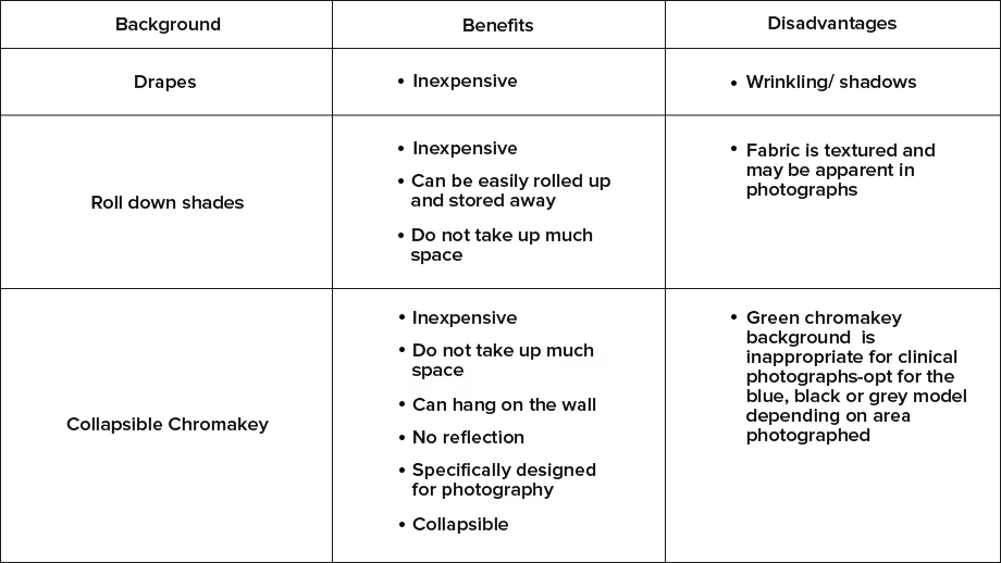 Sheets or drapes are inappropriate as backdrops as the undulations in the fabric show wrinkles and shadows, detracting from the photograph. A common issue that severely affects photo quality is the use of different backgrounds in photos: photographing a client in front of a laser or the wallpaper of the exam room shifts the focus from the patient and the clinical image to the background, which will often also cast irregular shadows.
