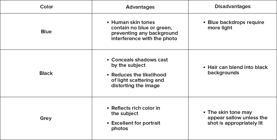Background colors The three most appropriate and effective colors to be used for a backdrop are blue, black and gray. Here are the pros and cons of each: