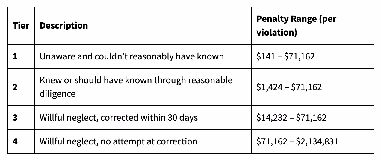 Most HIPAA violation cases are settled between the parties for an agreed amount, with no admission of liability required. However, the potential penalties vary significantly. HIPAA categorizes violations into four tiers based on the level of culpability: